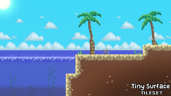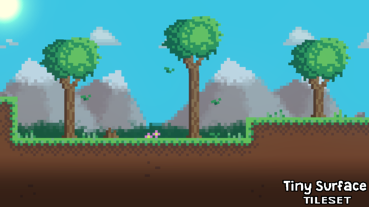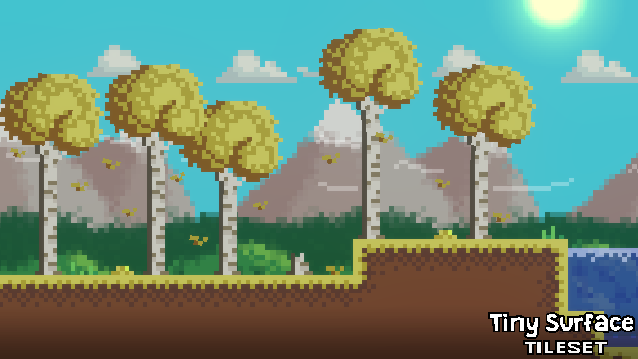 Tiny Surface is an 8x8 pixel tileset featuring Terraria inspired nature pixel art. Each variant includes all corner and edge configurations needed for use with autotiling in game engines.